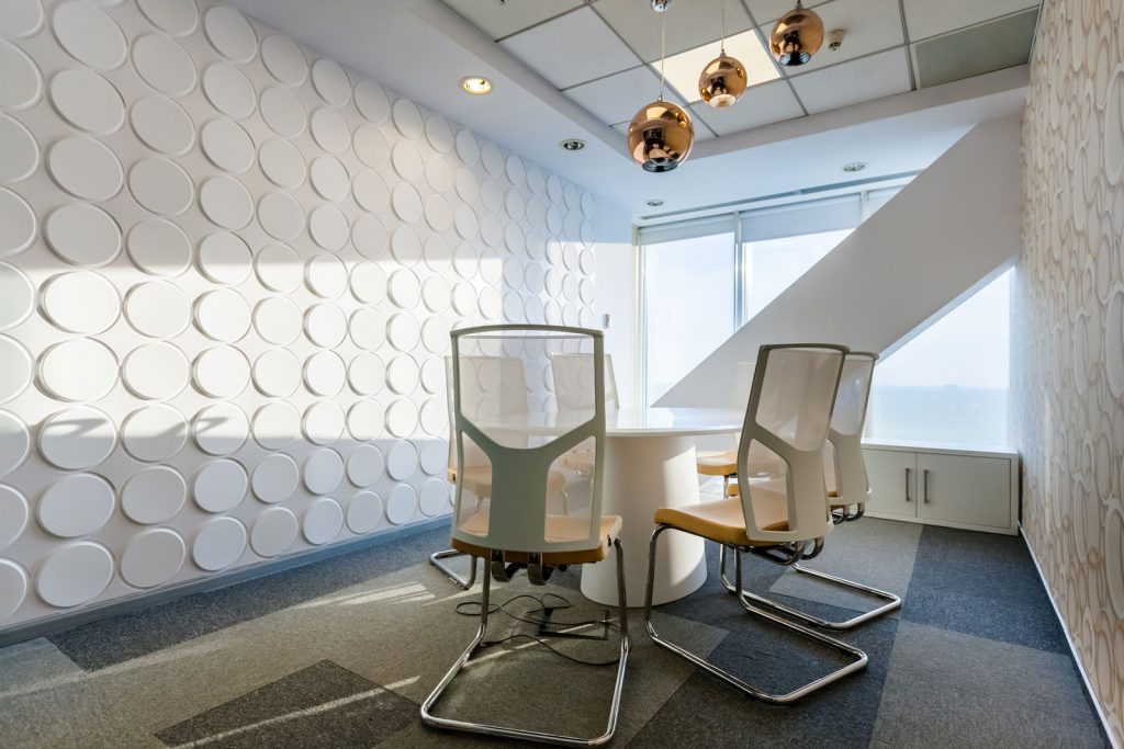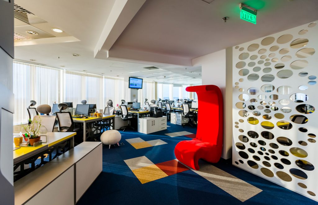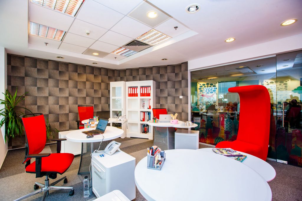 Ne-am jucat cu materiale diferite, in culori indraznete, dar in acelasi timp nu am uitat de functionalitate. Am adus placerea de a lucra si utilitatea in tot ce inseamna mobilier, panouri decorative, mocheta etc. Si zona de meeting s-a transformat dintr-o camera obscura intr-un spatiu confortabil, cald, cu iz de vacanta. Cine spune ca nu te poti simti ca pe o plaja exotica, fie si atunci cand ai o intalnire alaturi de clienti importanti? 🙂