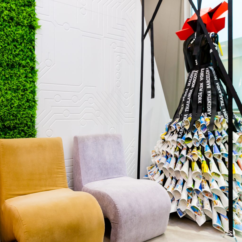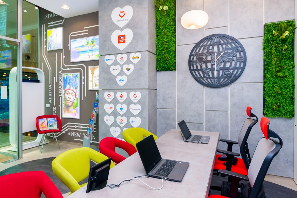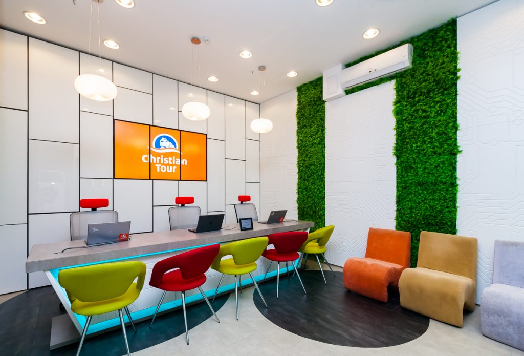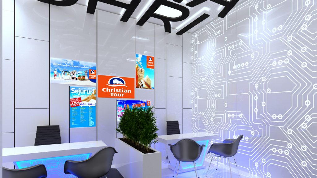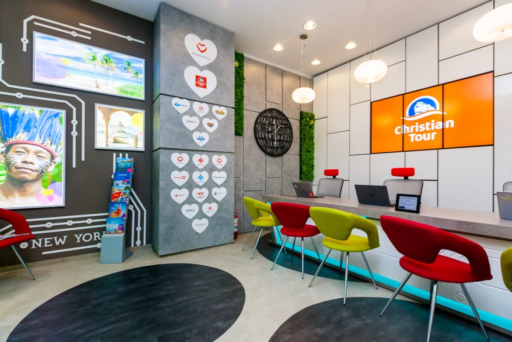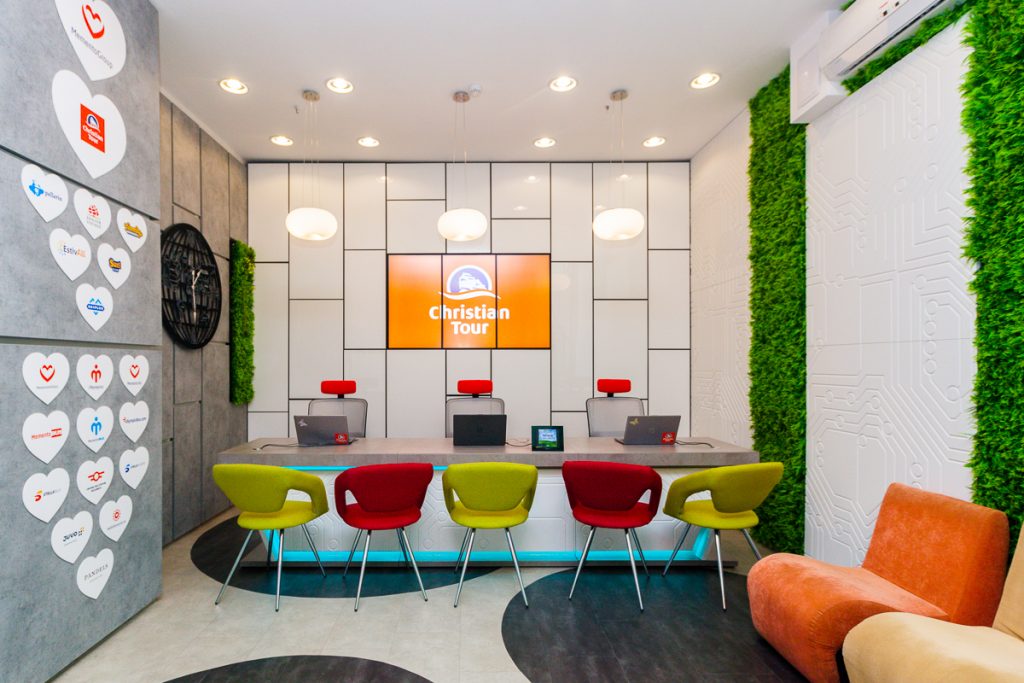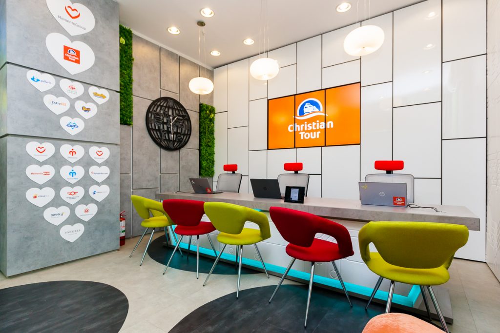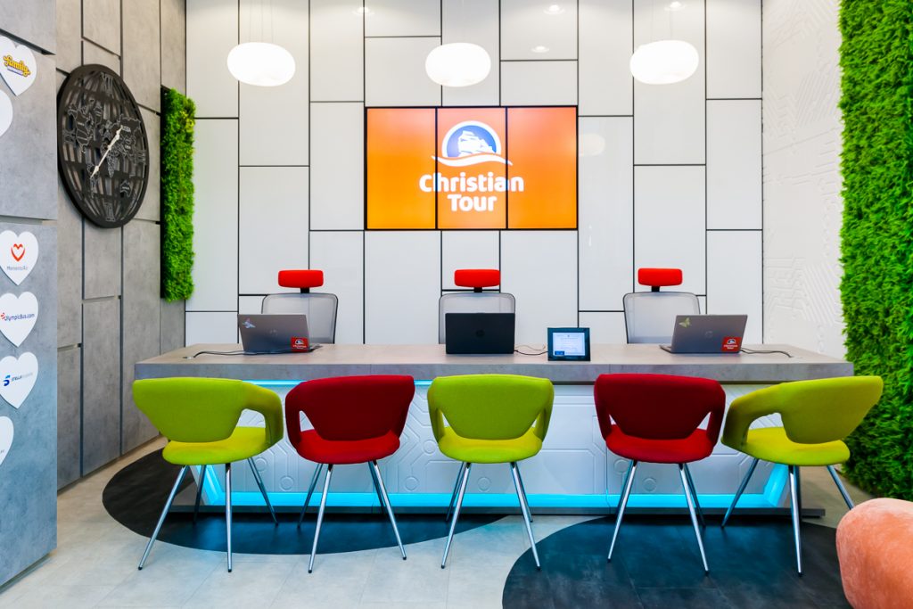 In acest sediu s-au folosit noile elemente ale identitatii vizuale Christian Tour – inimile. Pentru ca atat ei, cat si noi dorim sa vedem turisti fericiti, indragostiti de vacante, am creat un spatiu idilic, plasand in incapere portiuni de verdeata pe segmente din cadrul peretilor.